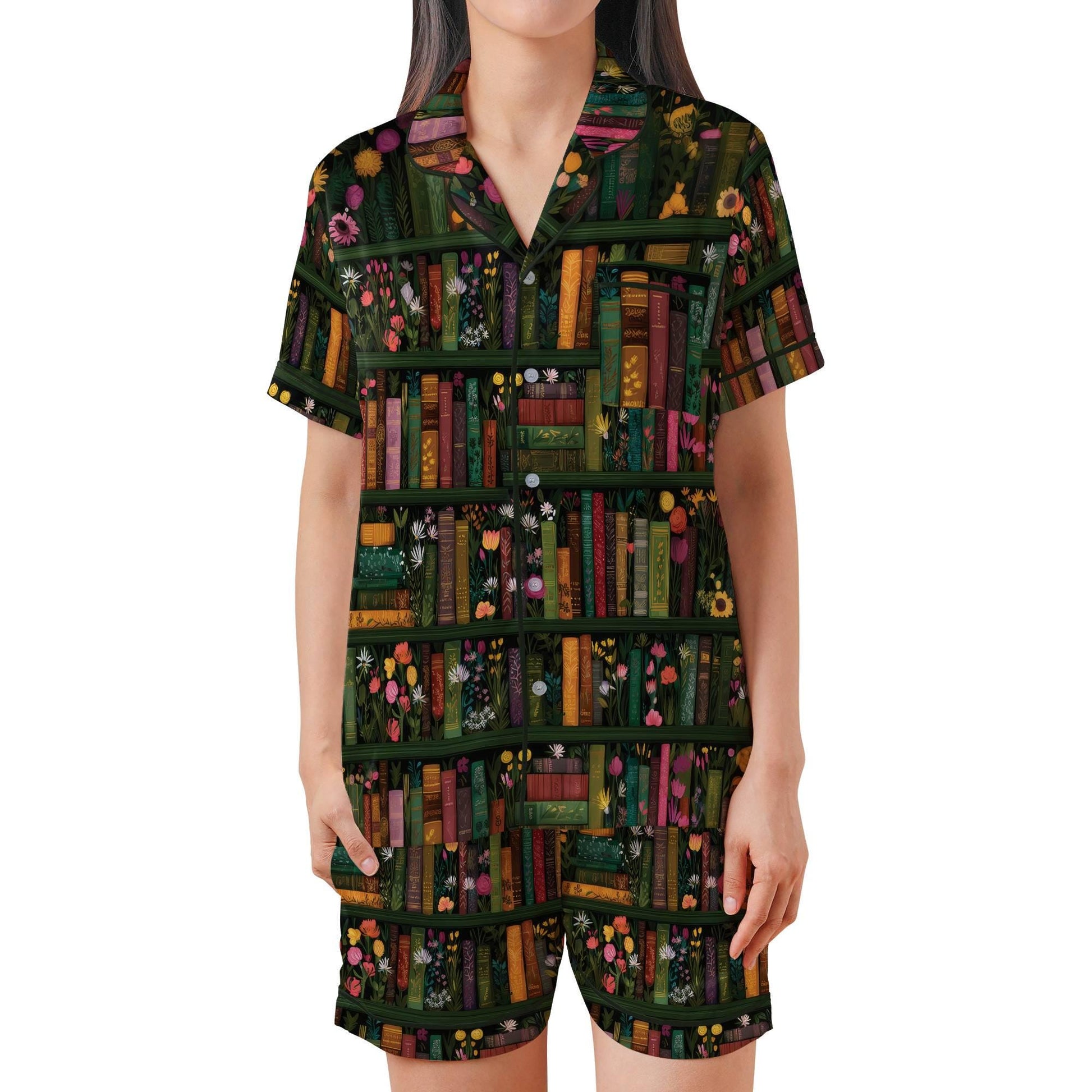 Book Short Sleeves Pajama Set, Book Lover Woman's Satin Pajama Reader Gift