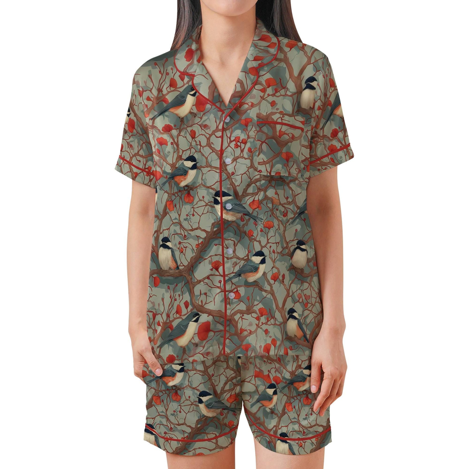 Chickadee Satin Pajama Set - Short Sleeve Bird Lover Gift Pajamas Set