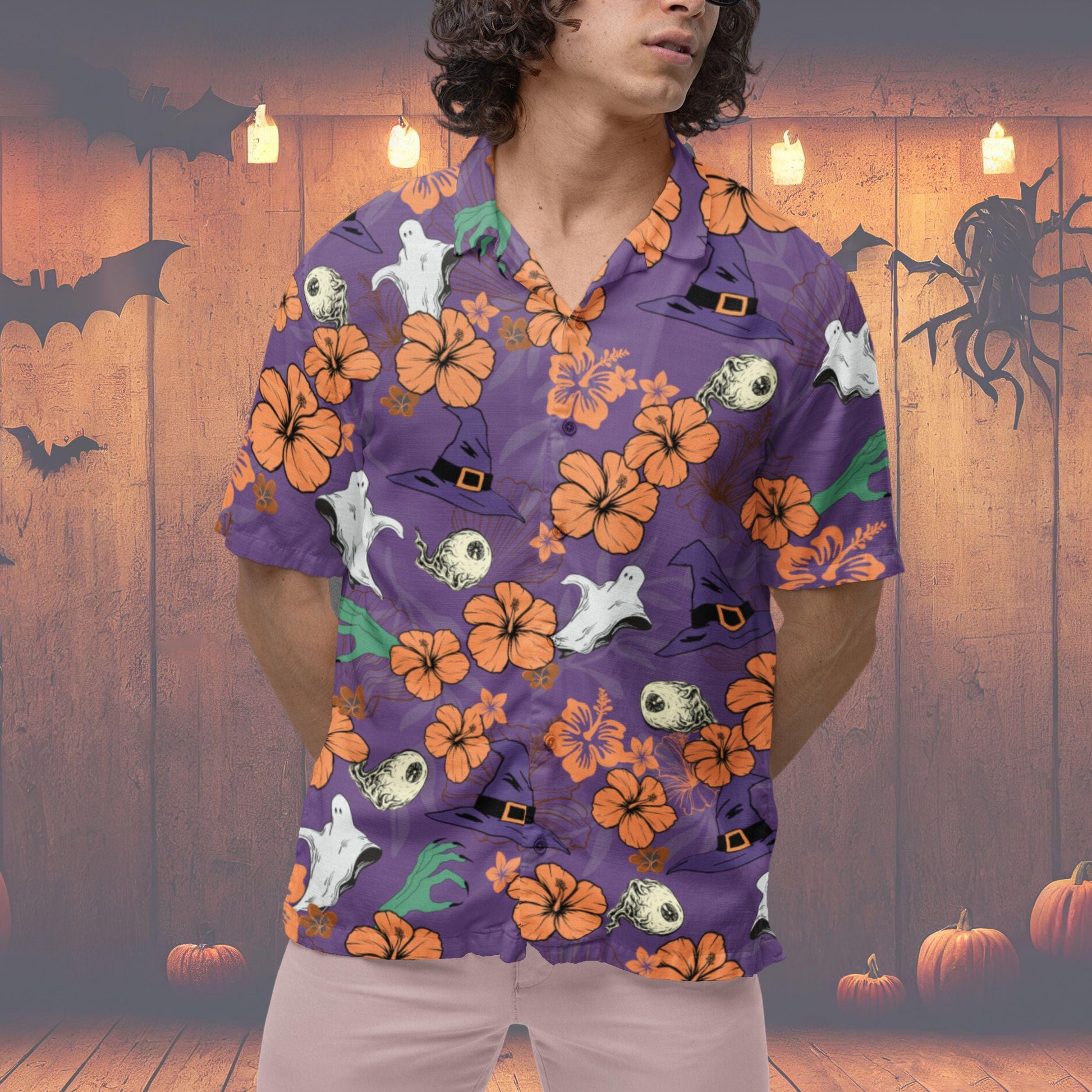Halloween Hawaiian Shirt, Halloween Button Down Shirt Witch Ghost Halloween Pattern