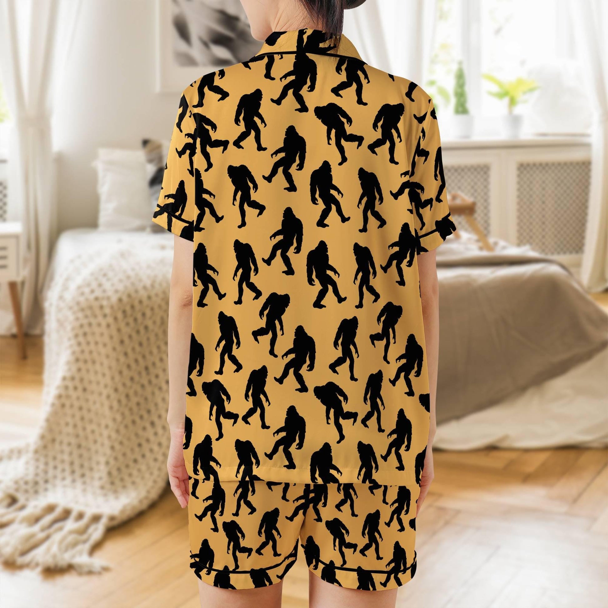 Sasquatch Pajama Set Short Sleeves, Bigfoot Woman's Satin Pajama Short Sleeve