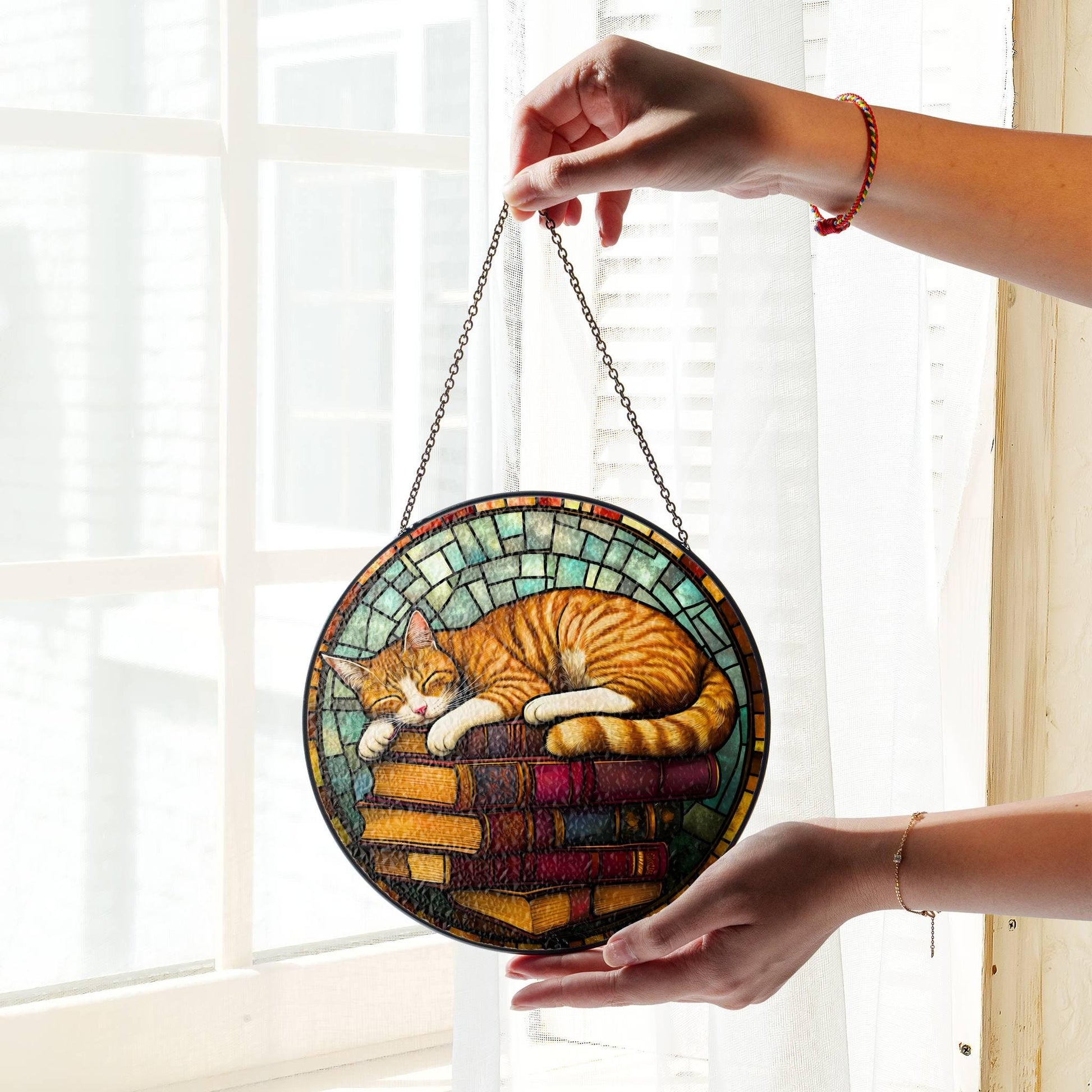 Sleeping Cat on Books Stained Glass Cat Memorial SunCatcher Window Hanging