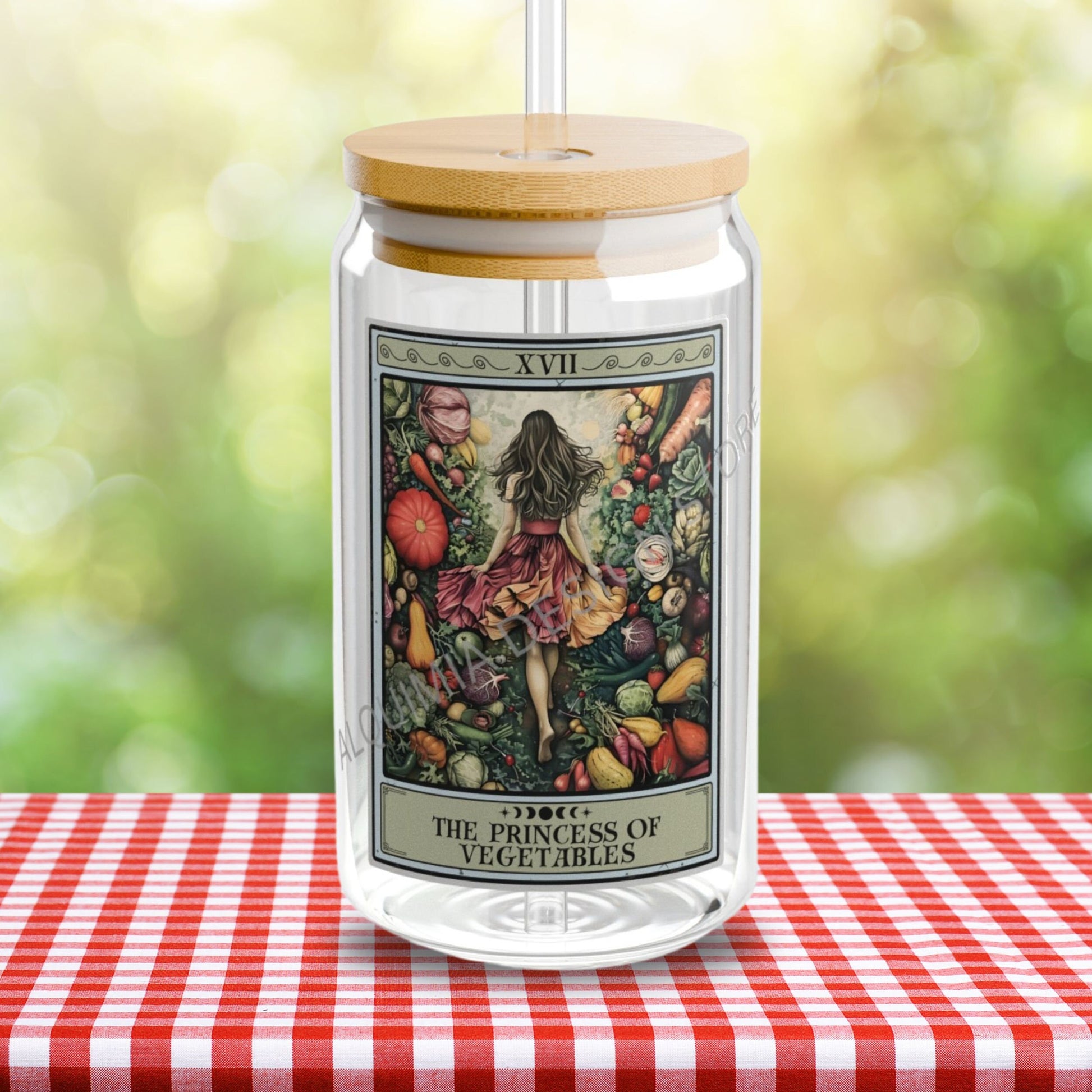 The Princess Of Vegetables Tarot Card Tumbler Sipper Glass 16oz Vegan Glass Can Tumbler with Bamboo Lid Vegetable Lover Can Glass Cup